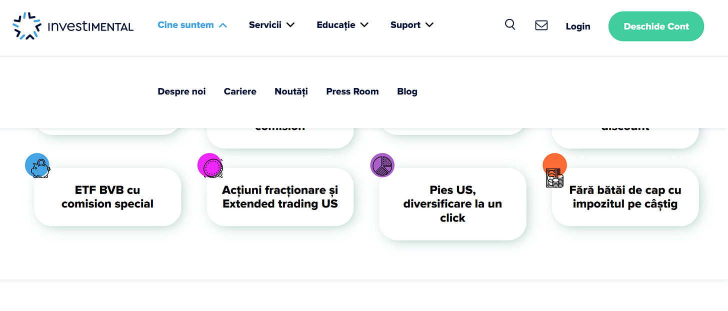 Printre brokerii români cunoscuți se numără Tradeville, Investimental, BT Capital Partners, BRK Financial Group, Goldring, Prime Transaction sau Estinvest — fiecare cu avantaje și limitări proprii. Eu am avut cont la Tradeville peste 10 ani, dar apoi m-am mutat tocmai din cauza lipsei de respect cu care au tratat o situație apărută chiar din vina lor. Acum lucrez cu Investimental, sunt mai noi pe piață, însă par în regulă, îi recomand cu dragă inimă. Am mai cochetat și cu Goldring, dar nu am văzut sensul în a-mi împrăștia deținerile peste tot, deși poate ar trebui, că uneori mai cad platformele când îți e lumea mai dragă. De platformele gen Revolut, v-aș recomanda să stați departe la capitolul investiții, e mult mai transparent și mai ieftin să mergeți pe mâna unui broker - doar SaltBank mi-a plăcut, e un fel de Revolut dezvoltat de Banca Transilvania, au introdus și secțiunea de investiții, cele în fondurile mutuale care replică BET de la noi par foarte OK, puteți să vă aruncați un ochi făcându-vă un cont gratuit2.